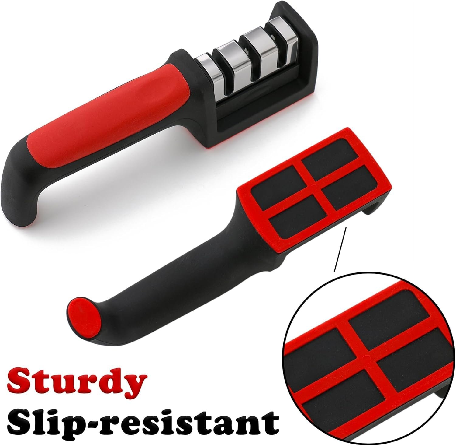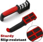 - ANTI SKID DESIGN: knife sharpener is equipped with an anti-skid rubber base, ensuring stability during blade sharpening. Additionally, its handle is ergonomically designed to provide a comfortable and secure grip while using the knife sharpening tool