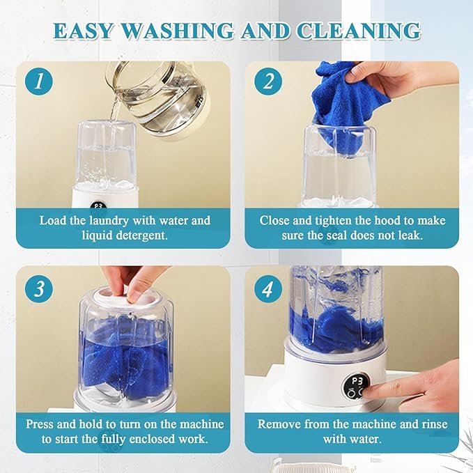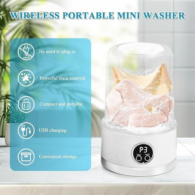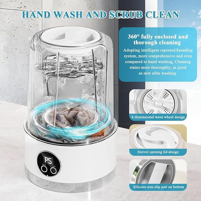 - Mini Underwear Washing Machine with Smart Cleaning Tech: Equipped with a 4D rotating turbine and waterfall spray, this cordless mini washing machine removes stubborn stains effortlessly. The sealed one-touch operation ensures no leaks, while the 390 all-copper motor delivers quiet, durable performance. Ideal for RV travel or apartments, it’s lightweight, waterproof, and requires no drainage setup—just pour water and wash!