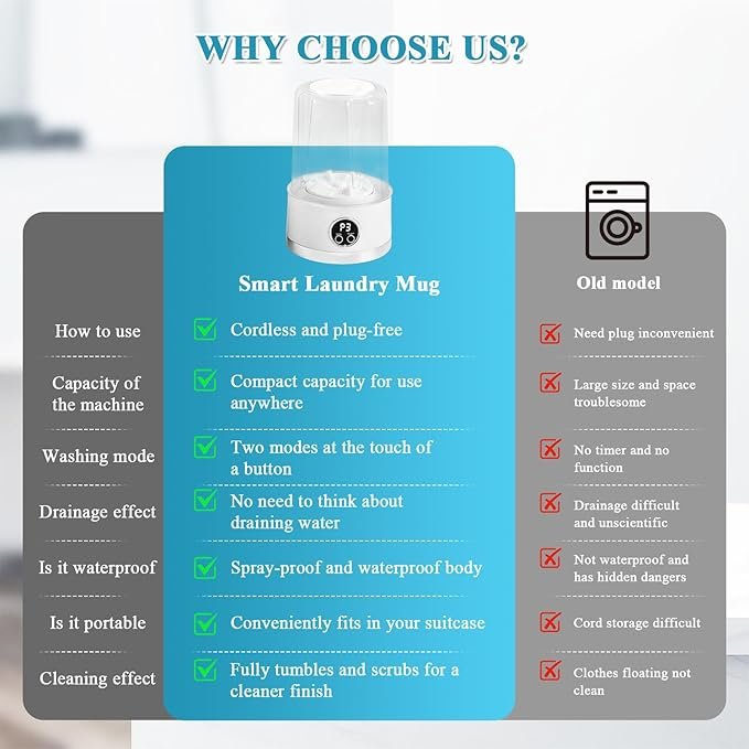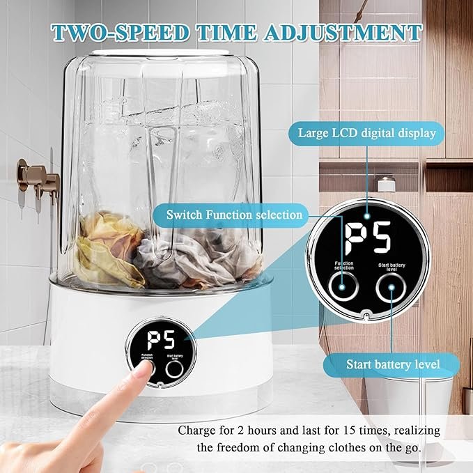 - Portable Washing Machine with 1500mAh Cordless Design: This wireless portable laundry cup offers ultimate convenience for travel or small spaces. Featuring a rechargeable 1500mAh battery, enjoy 15 washes per charge without cords. Perfect for underwear, baby clothes, or camping gear, its 1L collapsible design fits in luggage. Includes 2 time modes + 3C motor for powerful yet gentle cleaning. Say goodbye to messy sinks!